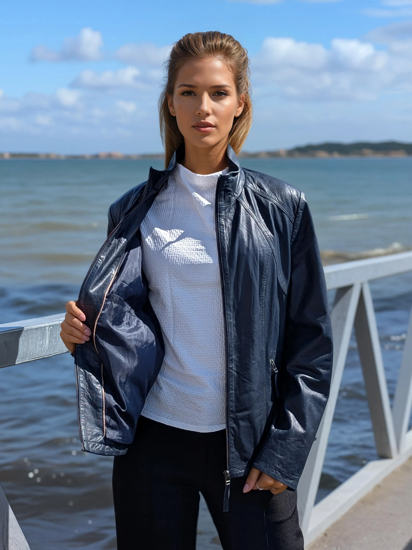 This navy lamb leather jacket by Levinsky combines luxurious softness with practical design. Featuring a smooth polyester lining and convenient inside pockets, it offers both comfort and functionality. Perfect for women seeking a stylish yet durable outerwear piece that enhances any outfit with timeless elegance.