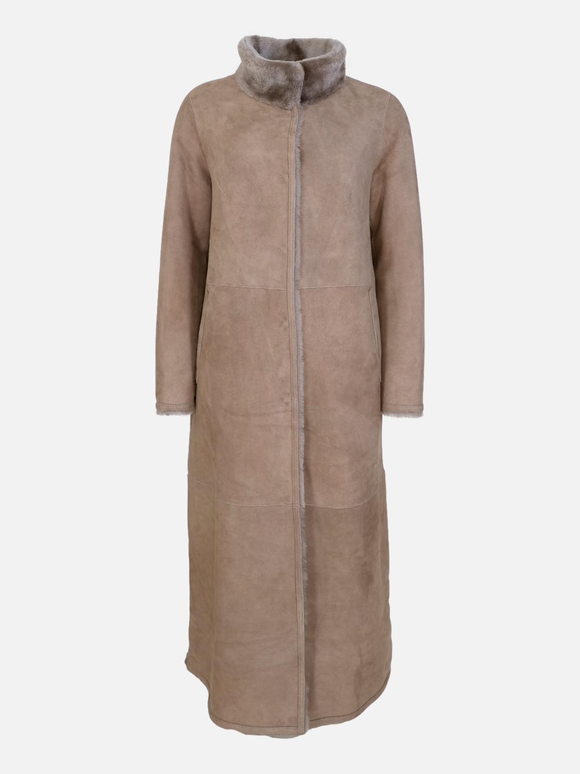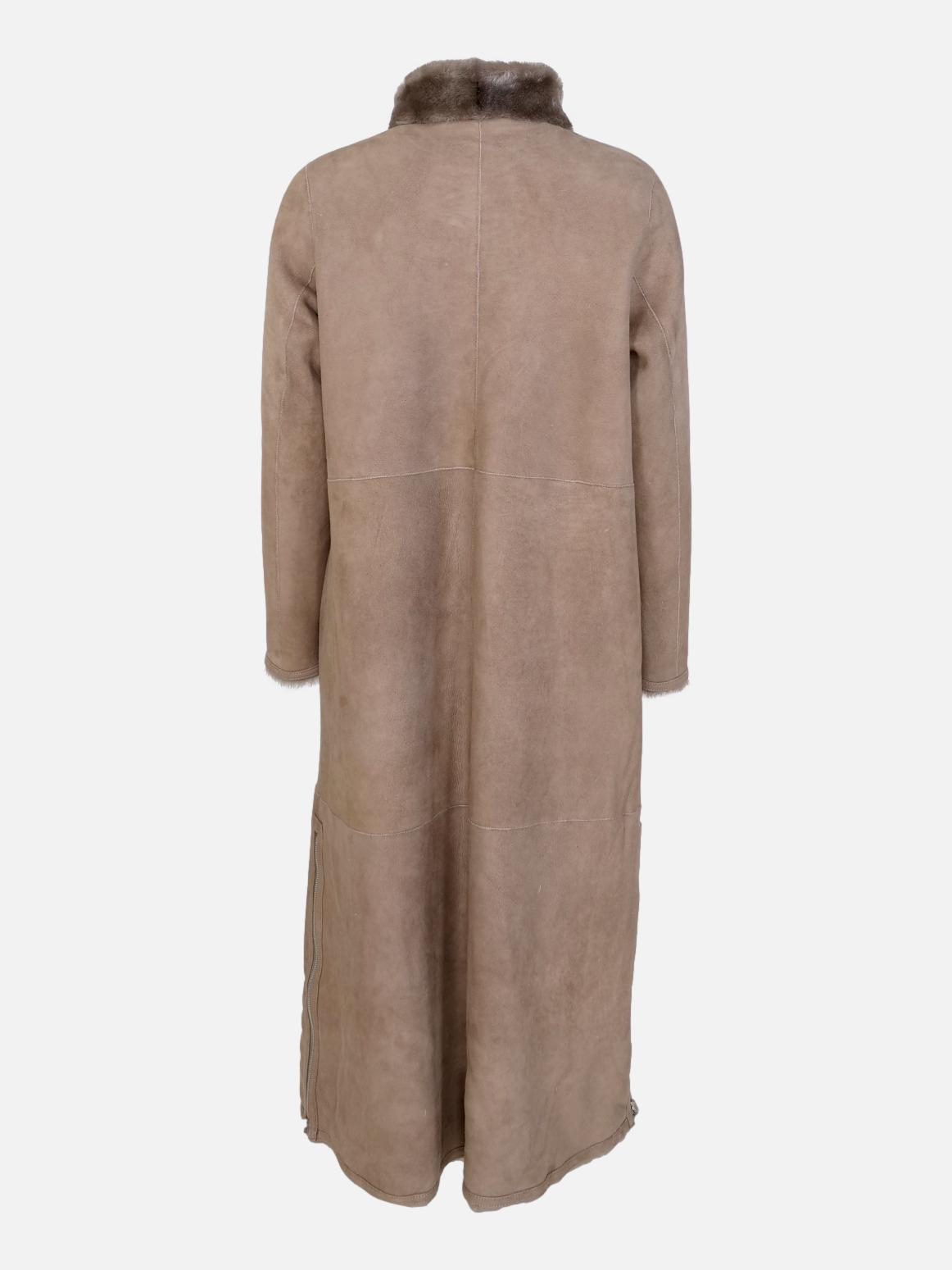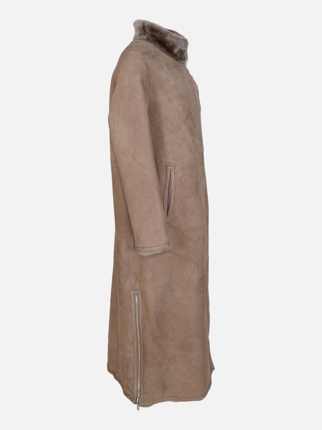 Long coat with fancy side vents with metal zippers so you have the option to close them. Besides this the coat is reversible which gives the opportunity to wear it with the fur outside as well.